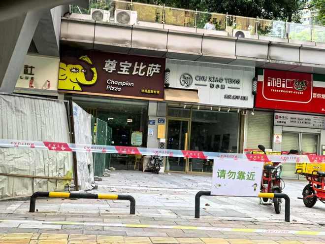 8月2日,澎湃新闻记者在现场看到,北辰三角洲(奥城)E3区6栋人行天桥附近的底商被拉起了警戒线,物业安排的人员阻止记者拍摄,并要求行人快速通过。