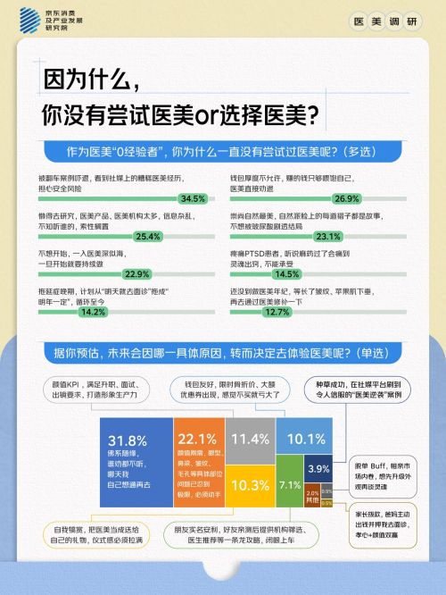 “很多人混淆了生活美容和医疗美容,部分消费者误以为医美等同于普通美容护理” ,京东健康体检中心(亦庄店)医疗美容科相关负责人表示,权威科普信源缺乏,社交媒体上的信息对消费者的影响很大。在此背景下,25.4%的人因“认知成本”过高而放弃尝试医美,他们表示,“懒得去研究,医美产品、医美机构太多,信息杂乱,不知听谁的,索性搁置”,此外,26.9%的人被价格劝退,他们因“钱包厚度不允许”而放弃,这在学生群体和初入职场的年轻人中尤为突出,还有23.1%的人因崇尚自然美而止步,14.5%的人因为怕痛不敢开始。