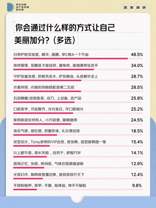 同时,人们对自身容貌的高满意度并不意味着对美的追求止步不前,恰恰相反,越来越多的人开始通过护肤、健身、低GI饮食、服饰穿搭等多元化手段实现全方位的美丽加分。48.5%的人坚持“精华、面膜、早C晚A”的精细化护肤,34%将“低糖低卡+健身房打卡”的身材管理列为日常,28.7%为守护发量配齐防脱洗发水与头皮精华,28.5%通过穿搭打造“第二五官”,18.5%通过普拉提、芭蕾形体提升体态气质。