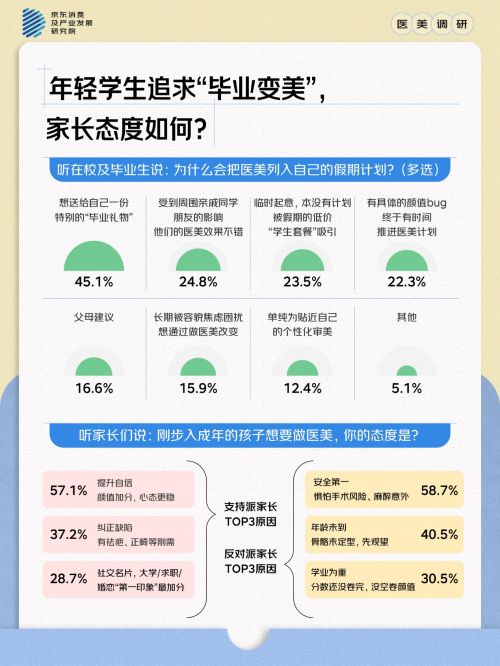 Z世代成医美消费新势力,36.7%用户为95后。52.9%毕业生将医美列入假期计划,诉求聚焦求职社交场景,家长态度审慎支持(31.7%要求必须陪同并选择正规机构)。