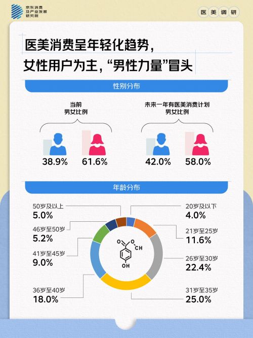 对于已经步入社会的年轻人来说,不仅思维活跃、善于接受新鲜事物,同时更是“悦己”人生态度的忠实拥趸,对自身形象有着更高的要求,这也促使她们更早地开始关注和尝试医美项目。25岁的插画设计师佳佳的经历很有代表性:“去年第一次尝试光子嫩肤,今年加了颈纹针,还在慢慢探索适合自己的项目。”这种渐进式消费模式正在成为主流,显示出年轻消费者对医美采取的是试水心态而非“all in”,她们更愿意通过小步快跑的方式找到适合自己的方案。京东健康体检中心(亦庄店)医疗美容科相关负责人也表示,目前抗衰需求升级,已经从“特定人群”扩展到“泛人群”,不再局限35+人群,25岁至30岁“初老预防”群体占比在提升。